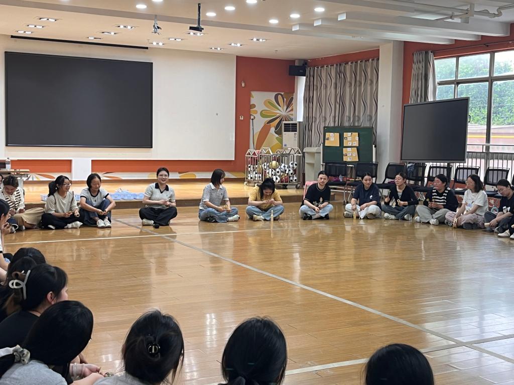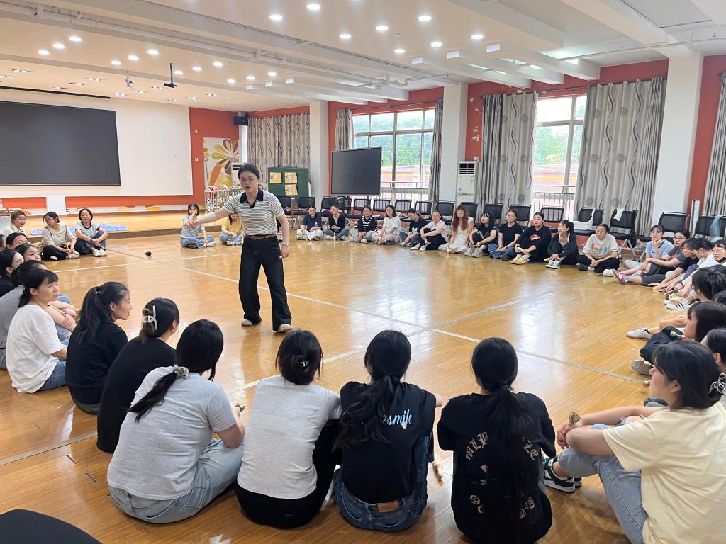 活动聚焦球、纸、纱巾、鸡蛋托、彩虹伞五种道具,设计节奏训练、舞蹈演绎、集体协作等多元内容。活动围绕五大实操模块展开。球的节奏训练中,教师们通过拍球、传接等动作感受节奏变化;纸的节奏创作环节,分组探索不同纸类动作的音效,合成立体节奏并模拟自然场景。纱巾舞蹈练习里,教师们完成单人律动、双人协作及分组创意造型,将视觉艺术与音乐结合;鸡蛋托节奏训练采用卡农形式,让教师理解多声部协作逻辑。最后,圈圈彩虹伞集体舞以 “花开式”“蛇形穿行” 等创意动作,提升教师集体协作教学能力。整场活动趣味性与实操性兼具,让教师们直观感受创意道具的教学价值。